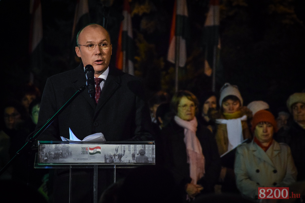 Takács Szabolcs Veszprém megyei kormánymegbízott ünnepi beszédében rámutatott, hatvan esztendeje annak az ősznek, amikor az egész világ Magyarországra figyelt. Mindenki megtanulhatta, a magyar szabadság szerető nép, képes az élete árán is harcolni, ha önállósága és nemzeti függetlensége a tét.