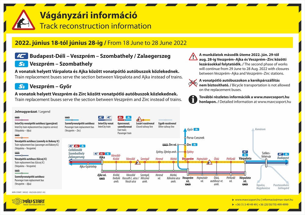 Pétfürdő és Ajka között végeznek pályakarbantartási munkákat júniua 18. és 28. között - tájékoztatott a MÁV. Ebben az időben a [Budapest –] Székesfehérvár – Szombathely vasútvonalon egyes vonatok módosított menetrend szerint közlekednek. Várpalota – Ajka állomások között vonatpótló autóbuszok közlekednek.