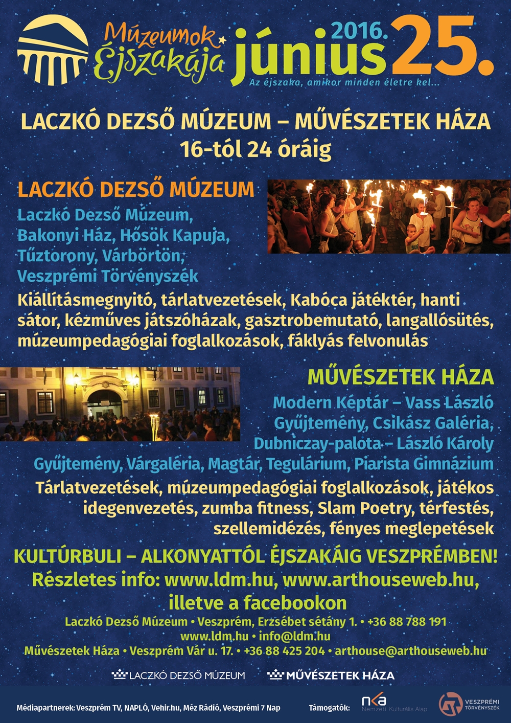 A Múzeumok éjszakáján várja a látogatókat a Laczkó Dezső Múzeum, a Hősök Kapuja Látogatóközpont, a Tűztorony, a Várbörtön, a Törvényszék, valamint a Művészetek Háza galériái. A részletes program a képre kattintva érhető el.