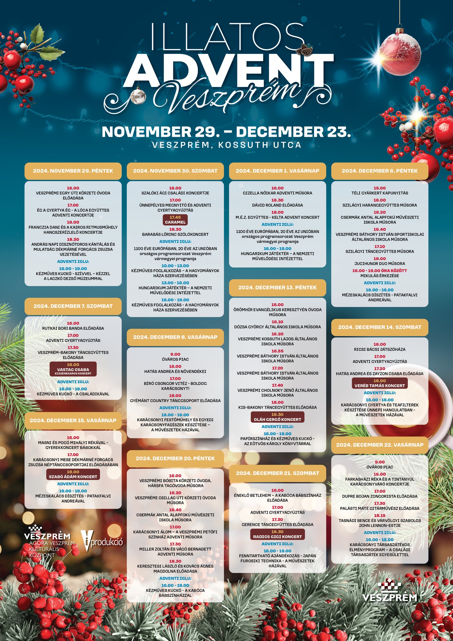 Töltsük együtt az ünnepvárás időszakát és tegyük varázslatossá az idei adventet Veszprém szívében! Adventi fények, ízek és illatok kavalkádja, koncertek, gasztroélmények és kézműves termékek várják a Kossuth utcára látogatókat az adventi időszakban - csalogatta az érdeklődőket az Agóra Veszprém Kulturális Központ.