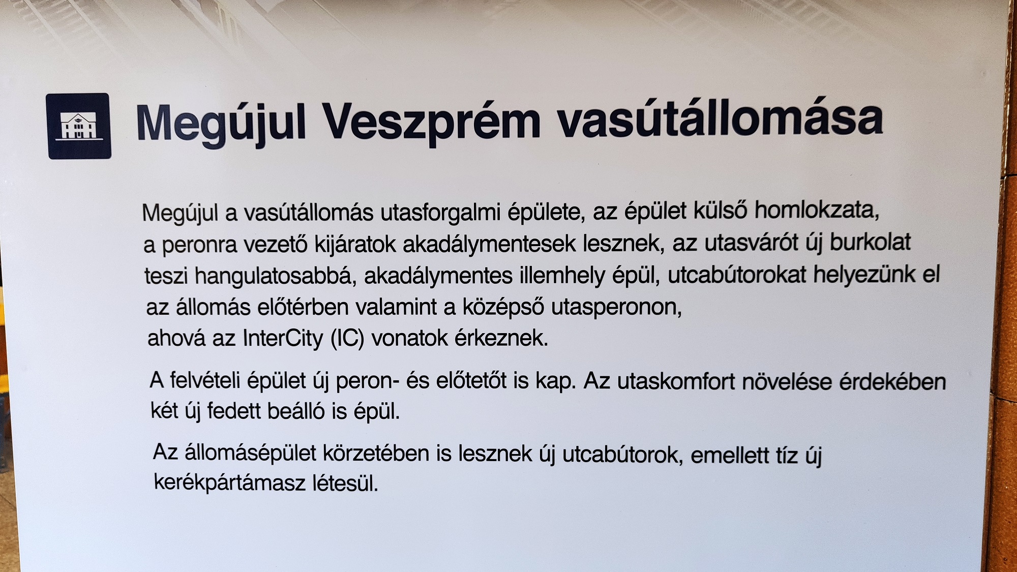 Európa Kulturális Fővárosa program évében megújul a veszprémi vasútállomás, a munkálatok február elején kezdődnek - hangzott el a csütörtöki sajtótájékoztatón. Nagy Bálint közlekedési államtitkár elmondta, fontos pillanat ez az egész térség szempontjából, több mint 1,1 milliárd forintból megújul a veszprémi vasútállomás. A kormány a hazai költségvetésből 750 millió forintot költ erre, a MÁV 350 millió forintot biztosít. A városképet javító fejlesztés valósul meg az előttünk álló hónapokban, de fontos cél volt az is, hogy tovább tudjuk növelni az utazás komfortját. - Az idei év közepére egy olyan fejlesztést adhatunk át, ami sok veszprémi és ide látogatónak örömet okoz - hangoztatta az államtitkár.
