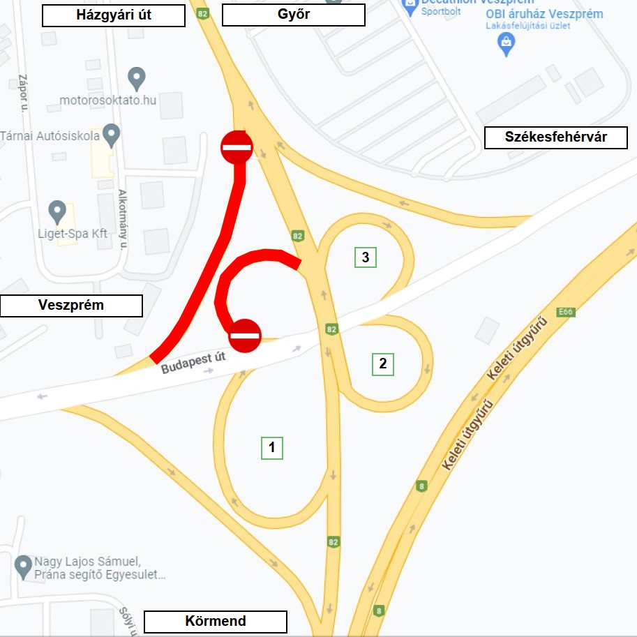 Az 1. sz. ábrának megfelelően lezárásra kerül a két pirossal jelölt csomóponti ág, a Győr felől érkezők a csomópont többi ágát (a térképen jelölt sorrendben) felhasználva érhetik el Veszprém irányába a Budapesti utat július 25-től.