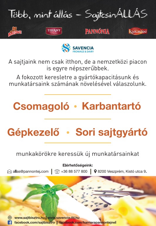 Csomagoló, karbantartó, gépkezelő, sori sajtgyártó munkakörben keresnek munkatársakat.