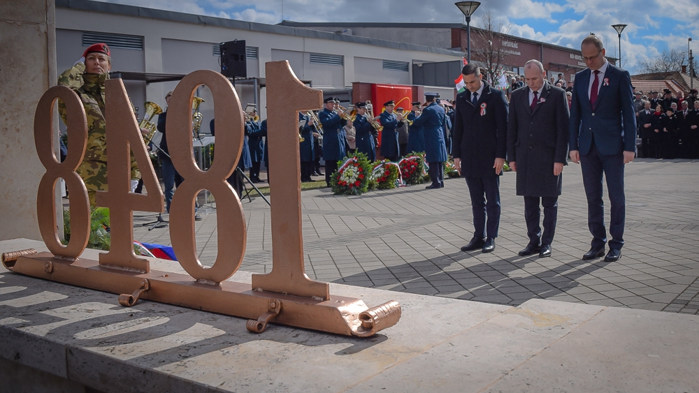 Az 1848-49-es forradalom és szabadságharc 171. évfordulója alkalmából tartottak ünnepi megemlékezést és koszorúzást a Dózsa téren pénteken délelőtt.