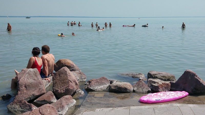 A nyáriasan meleg idő sokakat bátorított, hogy megfürödjenek a Balatonba.