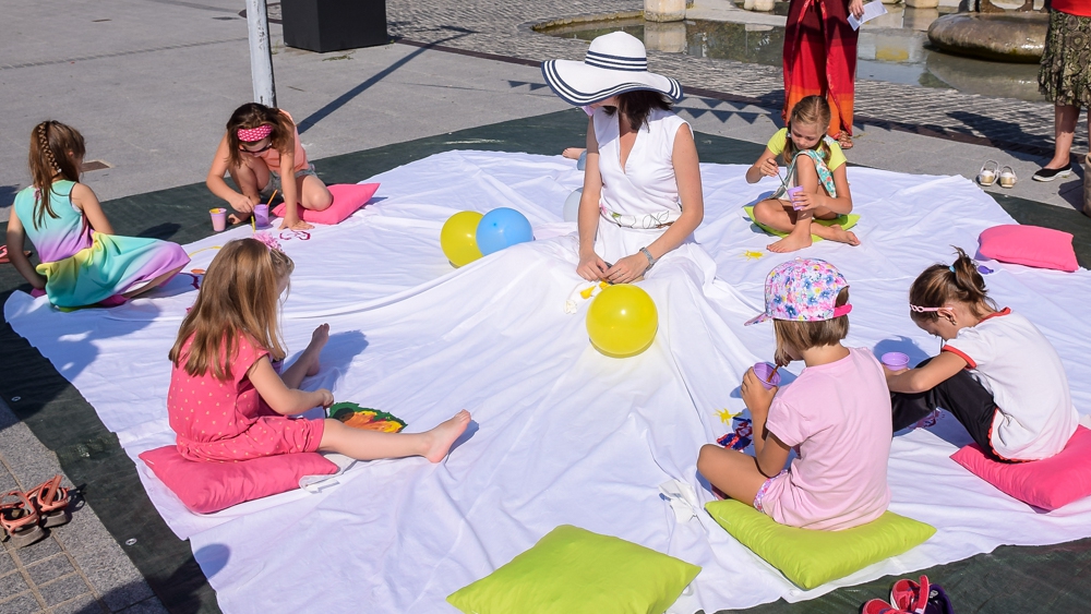 Szülinapi óriás szoknyakifestő mókára hívta a gyermekeket a Gombrich Mester Művészeti Tanodája szombaton délelőtt a Kossuth utcán.