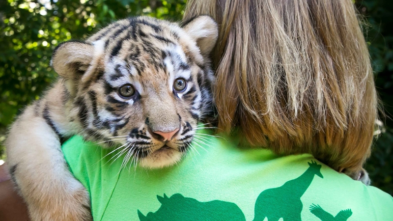 Immár több mint 5 kilós Borisz, a Veszprémi Állatkert hím szibériai kistigrise, aki szemmel láthatóan jól érzi magát gondozója féltő ölelésében.