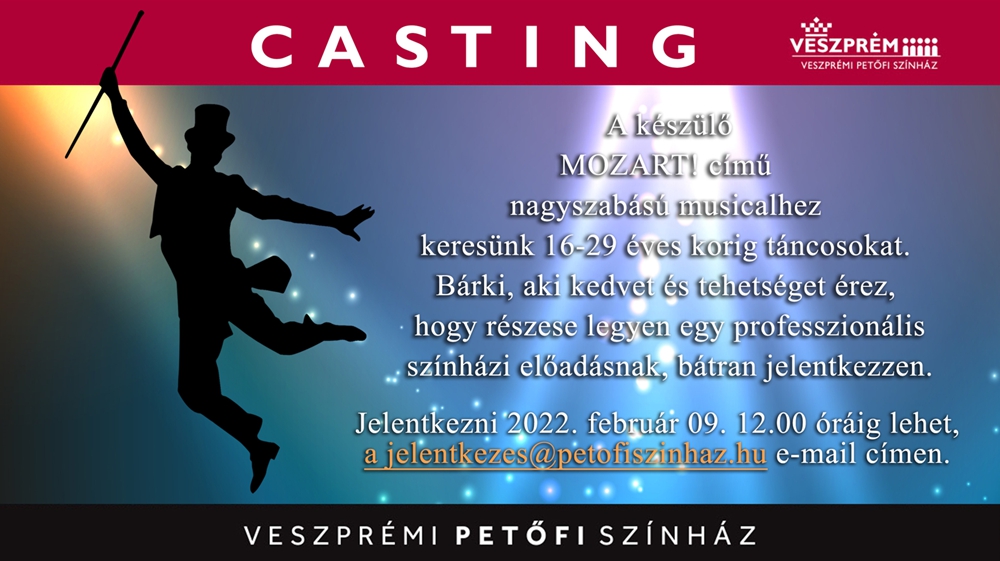 készülő MOZART! című nagyszabású musicalhez keres 16-29 éves korig táncosokat a Veszprémi Petőfi Színház.