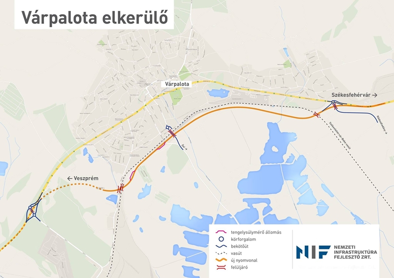 A várpalotai elkerülő úthoz három felüljáró és két vasúti híd épül. A nehéz terepen épülő közel 6 km-es szakaszt a tervek szerint jövőre adják át, a 8-as út Székesfehérvár és Veszprém közötti 28,8 km-es szakasza 2018 végére válik kétszer két sávos gyorsforgalmi úttá - számolt be a fejlesztésről korábban a magyarepitok.hu.