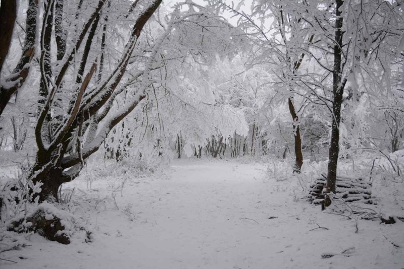Veszprémből szerdán reggel indultam el busszal Olaszfaluba. Eplényben még csak óriásira nőtt zúzmara borította be a fákat, de Eplényt elhagyva már havas volt a falutól északra fekvő terület. A fehér táj felett sűrű köd ült, így különösen szerencsés, hogy az ember a hóban a saját lábnyomait követve visszatalál a kiindulópontra. Olaszfalu déli részére sétáltam ki, a falu szélén, ahol nem takarították már el a lakosok, boka felett ért a hóréteg, ez nagyjából 12 cm-es havat jelent. A közeli erdő fáin a meglévő zúzmarára hullott rá a hó, a vastag fehér bundába bújt ágak le is hajlottak a rájuk nehezedő súlytól. Az erdőt járó apró madarak sorra rúgták le a faágakról a zúzmarás-havas öltözetet, ahogy élelem után kutattak, az erdő alján vadak sokasága hagyott nyomot a hóban. Igazi téli hangulat van a Magas-Bakony e szép pontján!