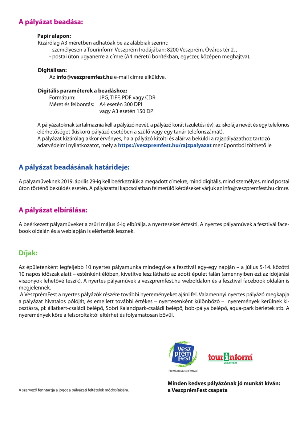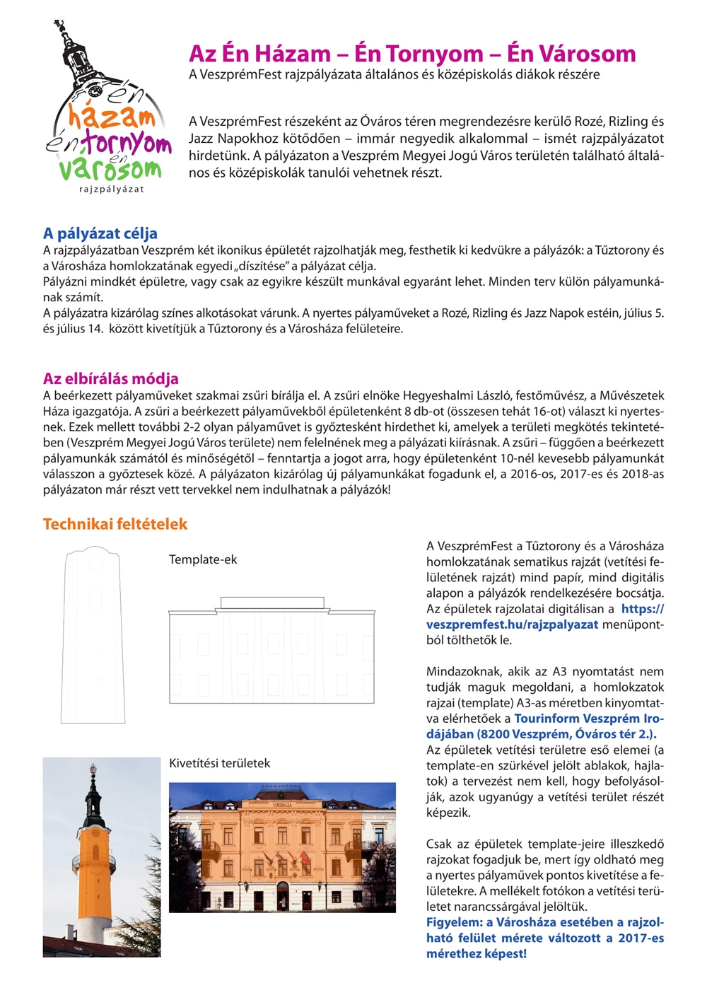 A részletes pályázati kiírás és a homlokzatok vetítési felületeinek sematikus rajzai letölthetők a https://veszpremfest.hu/rajzpalyazat weboldalról, illetve átvehetők papír alapon az Óváros téri Tourinform irodában.