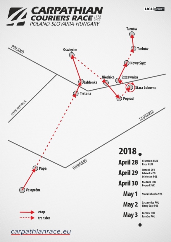 A Carpathian Couriers Race évek óta az egyik legrangosabb megmérettetés a 23 év alatti korcsoport számára Európában, hiszen az itt legeredményesebben szereplőkkel jó eséllyel találkoztunk később akár a Tour de France-on. Az idei, 6 futamos versenysorozat április 28-án startol el hazánkból mintegy 120 kerékpárossal, akik a hatodik napon Veszprém lengyel testvérvárosában, Tarnówban érkeznek célba.