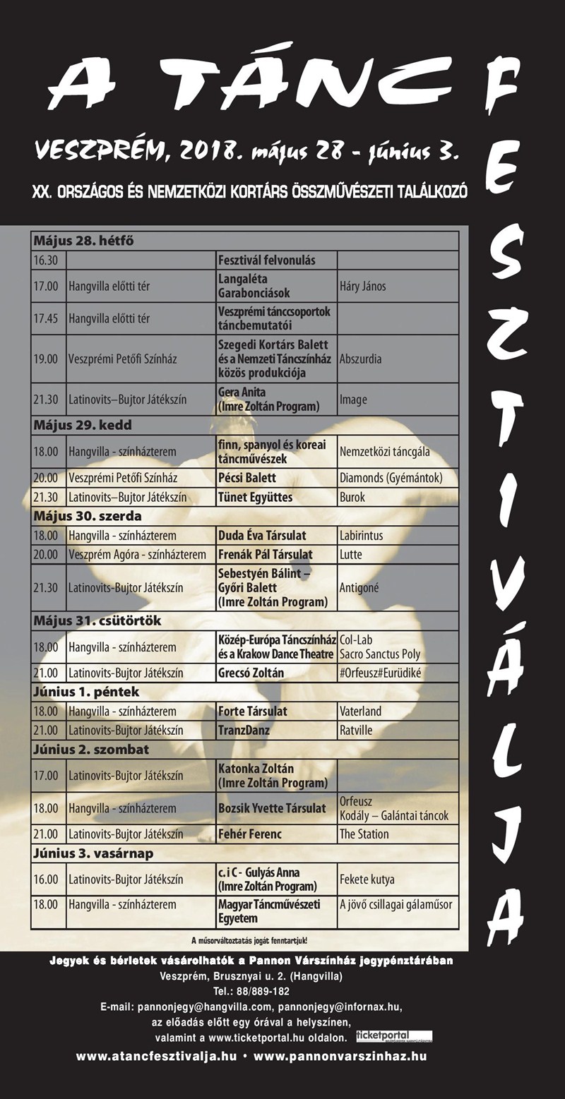 A Tánc Fesztivállal kapcsolatban elhangzott, számos különleges előadásra számíthatnak a nézők. Többek között érkezik a Tünet Együttes Burok című produkciója, amelyben négy táncos vallomása látható a szülésről. A nagyszínházi előadások közül kiemelték a Szegedi Kortárs Balett, valamint a Pécsi Balett előadását, ed Bozsik Yvett Társulata is látható lesz Veszprémben. Elhangzott, az Imre Zoltán Program részeként négy alkalommal pályakezdő koreografusok előadását tekinthetjük meg.