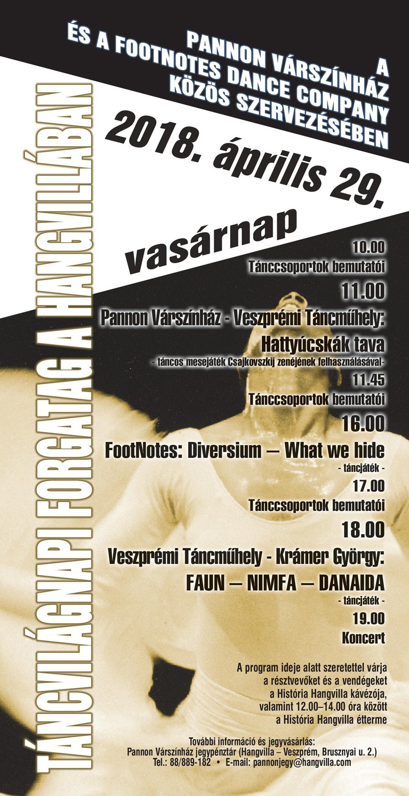 Krámer György művészeti igazgató tájékoztatása szerint a fesztivál előrendezvényeként a tánc világnapja alkalmából óriási forgatag várja a veszprémieket április 29-én a Hangvillában és környékén a Footnes Dance Company közreműködésével.