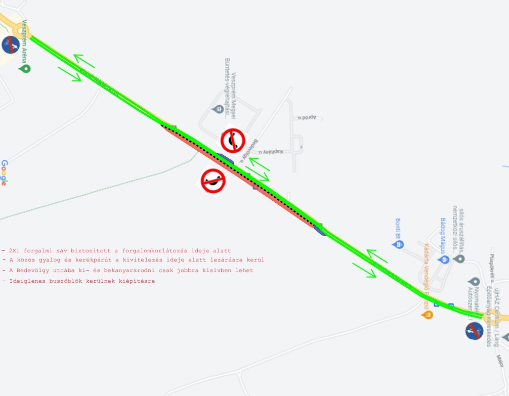 A Bedevölgyi utca irányába a balra nagyívbe való fordulás Veszprém felől tiltva lesz, a Bedevölgyi utcába Veszprém irányából az úgynevezett kádártai körforgalomból visszafordulva Veszprém irányába a 82. sz. főútról jobbra kisívbe lehet befordulni. A zavartalan buszforgalom biztosítására ideiglenes buszperonok kerülnek kiépítésre.