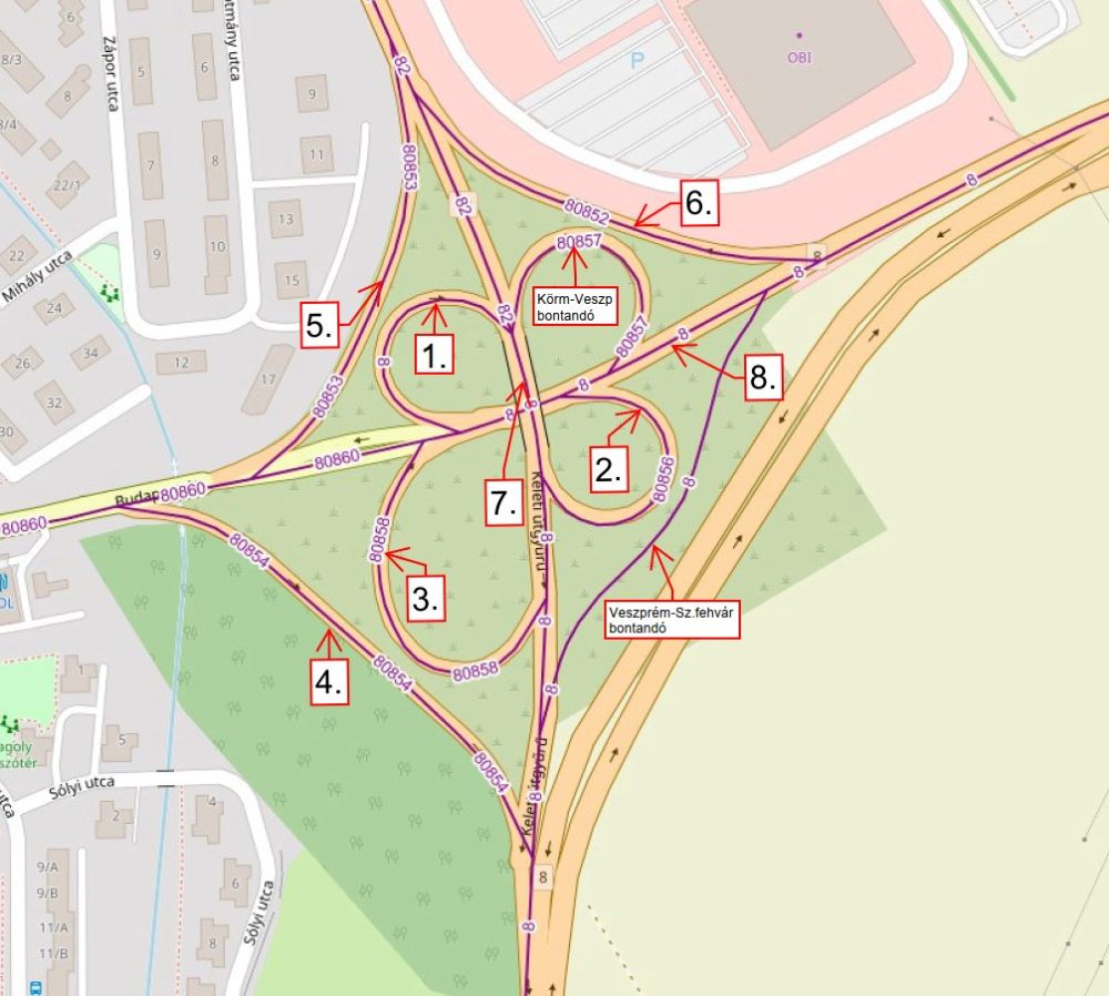 Régi Budapesti csomópont burkolatcseréje miatt időszakosan lezárásra kerülnek a csomóponti ágak, ezek várható ütemezése a térképi jelölés szerint: