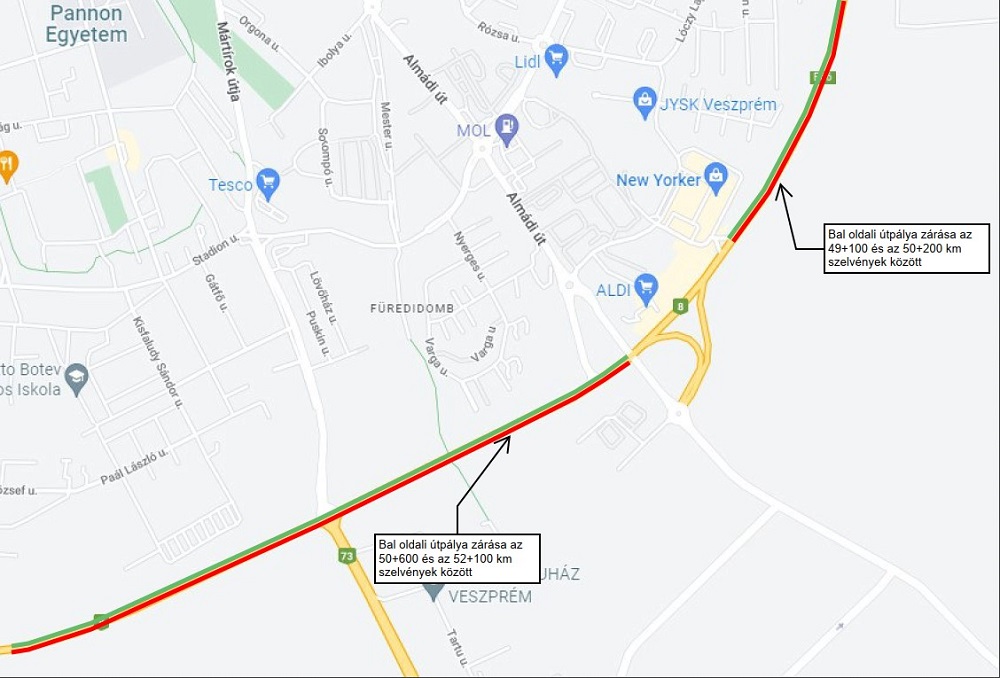 Veszprémben a 8. sz. főút Litéri és Füredi csomópontja között a NIF Zrt. beruházásában megvalósuló projekt építési munkálatai során a közlekedők az elkövetkező időszakban továbbra is ideiglenes forgalomkorlátozásokra és terelésekre számíthatnak. Ehhez kapcsolódóan a 8. sz. és a 82. sz. főút összekötésének megvalósítása során a 82. sz. főúton is nagyobb mértékű terelések várhatóak - közölte a NIF Zrt.
