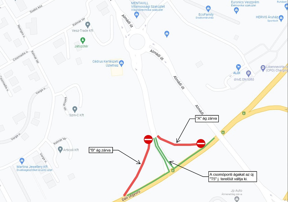 2022 tavaszán, április 20-tól a 8. sz. főút új pályájának kialakítása és az elkészült csomóponti ágak kapcsolatának kialakításának érdekében az átadott, Almádi csomópont Veszprém felőli oldalának le- és felhajtó ágai ideiglenesen lezárásra kerültek. A közúti forgalom biztosításának érdekében ideiglenes terelő út (T5 jelű terelőút)lett kialakítva. A terelés várható befejezése 2022. június vége.