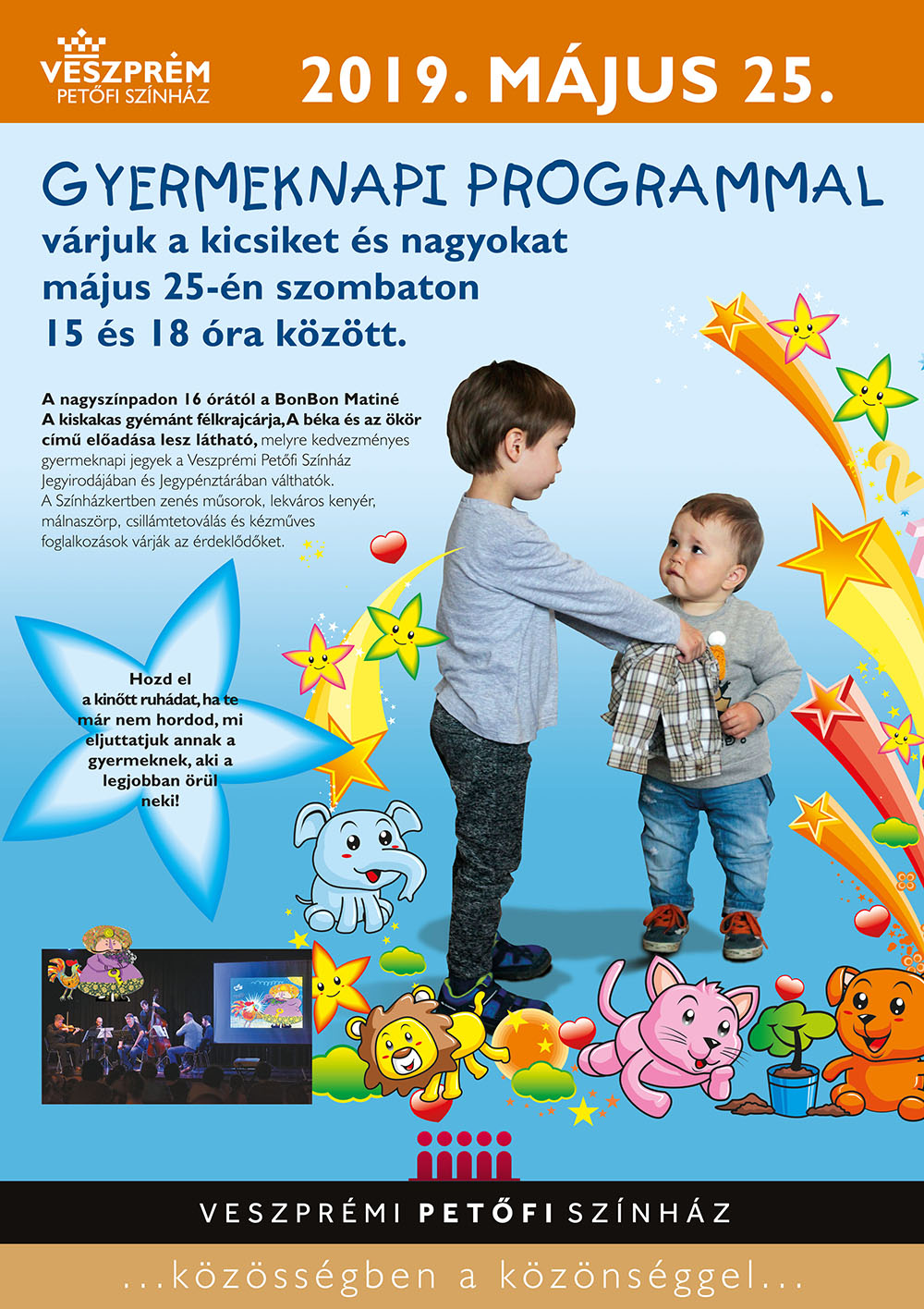 Május 25-én, szombaton 15 és 18 óra között várják a kicsiket és nagyokat a Veszprémi Petőfi Színház gyermeknapi programjára, aminek részeként a jövő évados gyermekbérletet kedvezménnyel értékesítik. A Színházkertben zenés műsorok, vetélkedők, lekváros kenyér, málnaszörp, csillámtetoválás és kézműves foglalkozások várják az érdeklődőket. A nagyszínpadon 16 órától A kiskakas gyémánt félkrajcárja" és "A béka és az ökör" című előadás teszi még tartalmasabbá a napot.