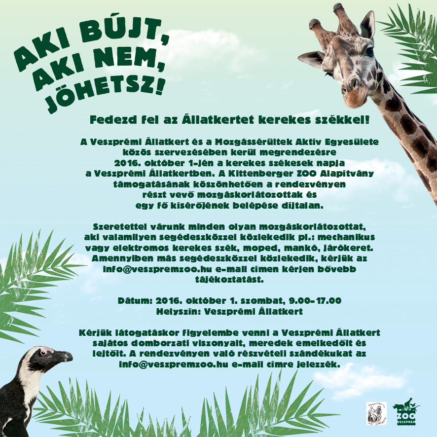 A Kittenberger ZOO Alapítvány támogatásának köszönhetően a rendezvényen részt vevő mozgáskorlátozottak és egy fő kísérőjének belépése díjtalan.