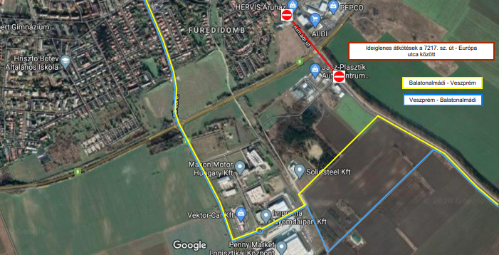 Almádi irányából Veszprém az északi (sárga), Veszprém irányából Almádi a déli (kék) terelőúton közelíthető meg.