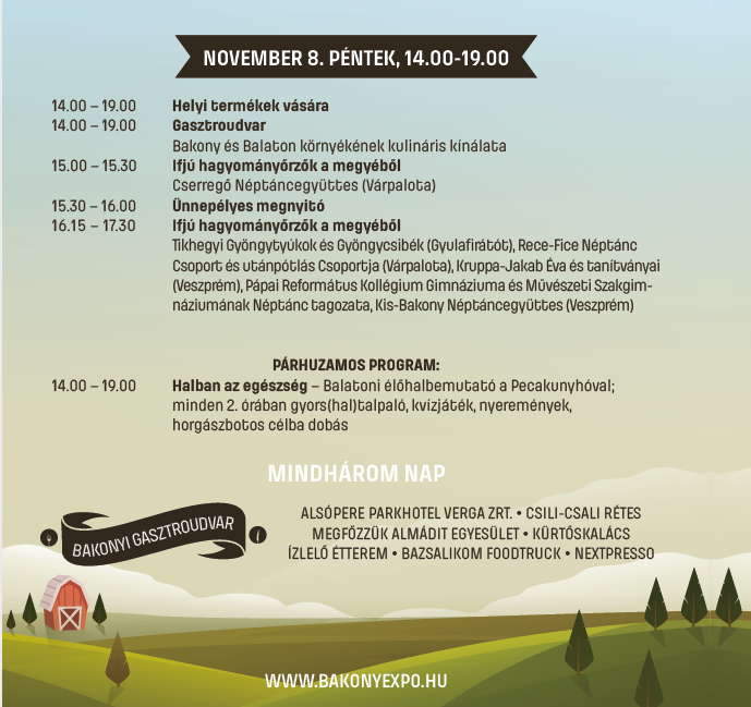 Elhangzott, a Veszprém Aréna küzdőterén 122 őstermelő kap helyet, továbbá húsz szakmai és civil szervezet is jelen lesz a Bakony Expón. A termelők többsége Veszprém megyéből érkezik. A látogatók többek között tejtermékek, húskészítmények, édességek, olajok, lekvárok, szörpök, borok, pálinkák és számos egyedi kézműves termék közül választhatnak a három nap alatt.
