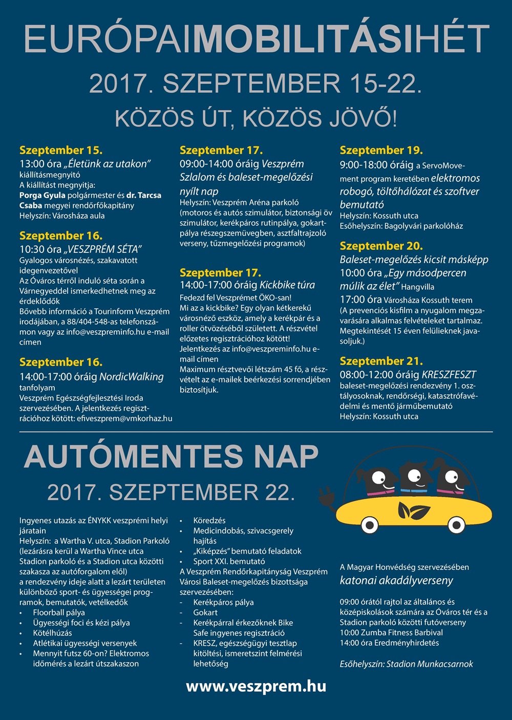 A gazdag eseménysorozat - amely ezúttal a Közös út, közös jövő! szlogent viseli - szeptember 15. és 22. között zajlik a megyeszékhelyen, amely az Autómentes nappal teljesedik ki. Idén a rendőrség mellett a honvédség részvételével is gazdagodott a program.