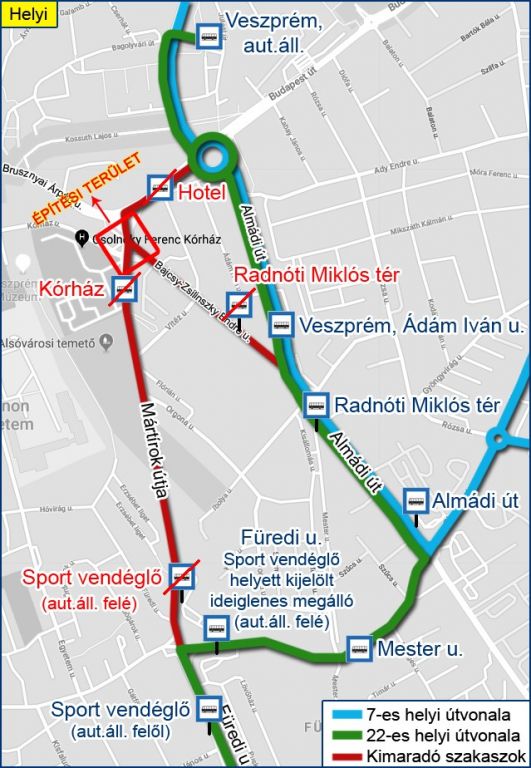 A 22 sz. vonal járatai Mártírok útja helyett a Budapest úti körforgalomtól az Almádi úton, a Cserepes és a Stadion utcán közlekednek a Füredi utcáig. Az autóbuszjáratok a Laci-major irányába nem érintik a Hotel és a Kórház elnevezésű megállóhelyeket, legközelebbi megállóhelyeik az Autóbusz-állomás és az Almádi úton kialakított Ádám Iván utca megállóhely, továbbá érintik még a Radnóti Miklós tér és a Mester utca elnevezésű megállóhelyeket. Az autóbusz-állomás irányába kimarad a Sport vendéglő elnevezésű megállóhely is, helyette a Füredi utca, a Mester utca, az Almádi út és az Ádám Iván utca elnevezésű megállóhelyeken állnak meg a járatok.