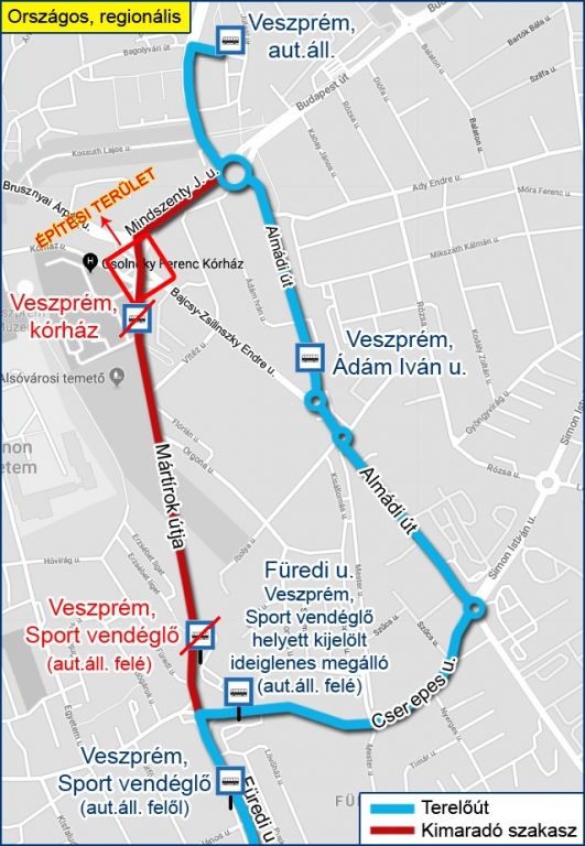 Az útlezárás miatt a Mindszenty József utca – Mártírok útja – Füredi utca útvonalon közlekedő országos és regionális járatok kerülőúton, az Almádi út – Cserepes utca – Füredi utca útvonalon közlekednek mindkét irányba, a mellékelt térkép szerint. A kerülő 0,6 km-rel hosszabb az eredeti útvonalnál. A kórház megállóhelyet egyik irányban sem érintik a járatok, helyette az Almádi úton kialakított, Ádám Iván utca elnevezésű megállóhelynél állnak meg. A Sport vendéglő megállót az autóbusz-állomás irányába szintén nem érintik a járatok, helyette a Füredi u. elnevezésű helyi megállóban állnak meg.