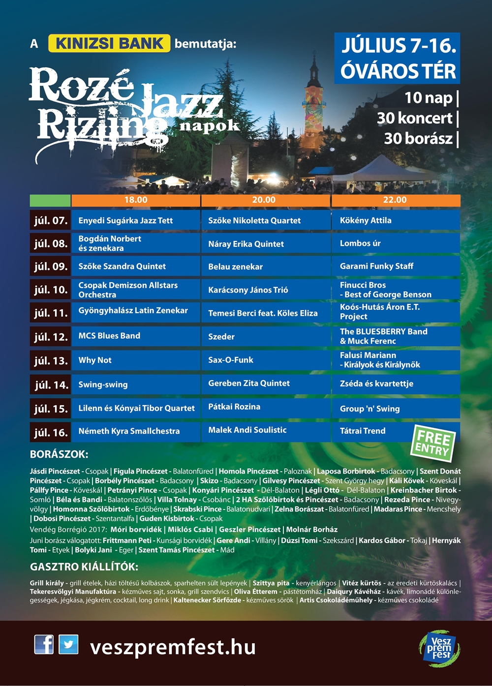A szervezők tájékoztatása szerint "Kökény Attila július 7-re tervezett, 22.00 órakor kezdődő koncertje a Rozé, Rizling és Jazz Napokon betegség miatt elmarad." Ebben az idősávban a United Experience lép a színpadra az Óváros téren, vendég: Mihályi Réka és Mujahid Zoli.