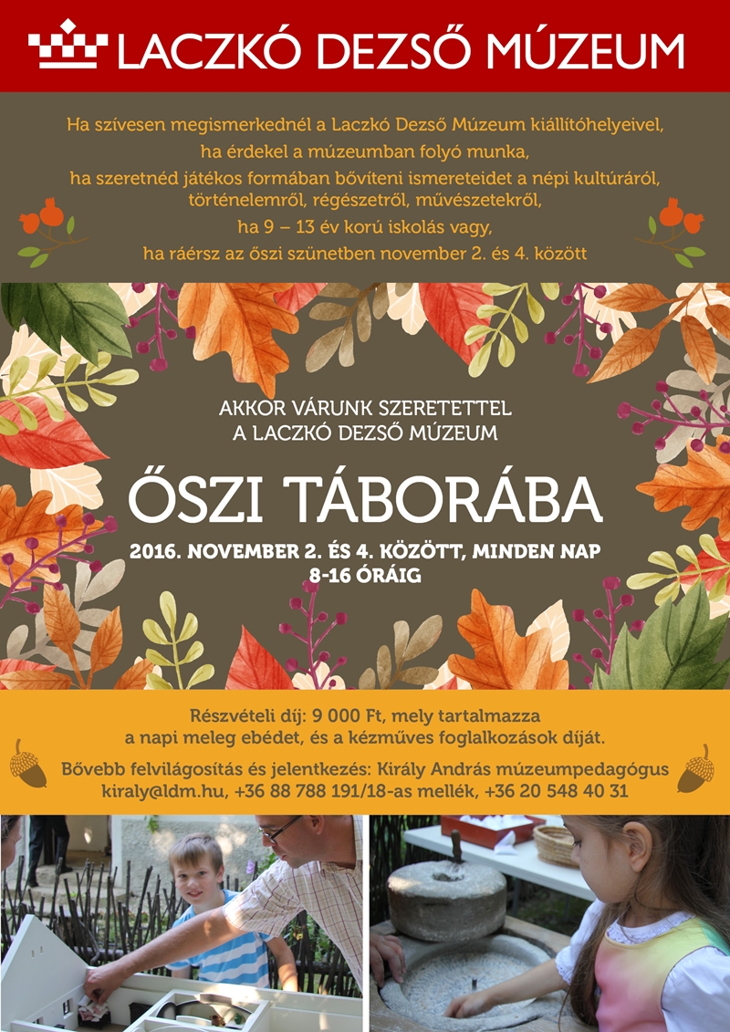 A Laczkó Dezső Múzeum idén rendhagyó őszi táborozásra várja a veszprémi, 9-13 éves gyermekeket. A nagy sikerű nyári táborok mintájára, az őszi szünet idejére, november 2-4-ig napközis tábort szervez a Múzeum.