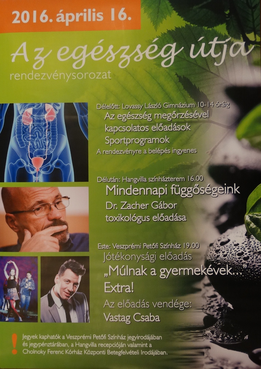 Leitold László, a Szövetség az Egészséges Veszprémért elnöke elmondta, a rendezvény részeként délelőtt egészség megőrzéssel kapcsolatos előadások, valamint sportprogramok várják az érdeklődőket a Lovassy gimnáziumban, délután dr. Zacher Gábor tart előadást a Hangvillában, este pedig jótékonysági produkcióval várják a nézőket a Petőfi Színházban, ahol a Múlnak a gyermekévek című dalválogatás erre az alkalomra összeállított változatával készül a társulat Vastag Csabával kiegészülve.