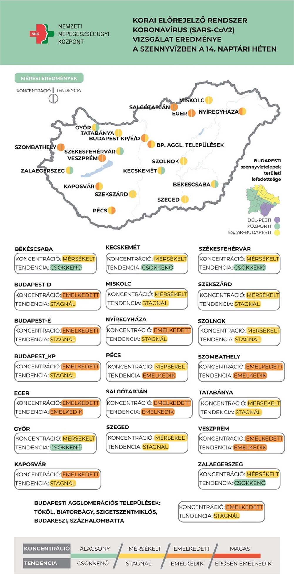 A 14. héten a szennyvízminták átlagos SARS-CoV-2 koncentrációja országosan továbbra is magas szinten ingadozik, az elmúlt öt hét összesített tendenciája alapján azonban enyhén csökken. Jelentős a területi eltérés a vizsgált települések között, amíg Egerben, Salgótarjánban, Szombathelyen, Veszprémben és kisebb mértékben Pécs esetében emelkedő a tendencia, addig Békéscsabán, Győrben, Székesfehérváron, Zalaegerszegen, és kisebb mértékben Kecskeméten csökkenő koncentrációt mértek - közölte honlapján a Nemzeti Egészségügyi Központ.