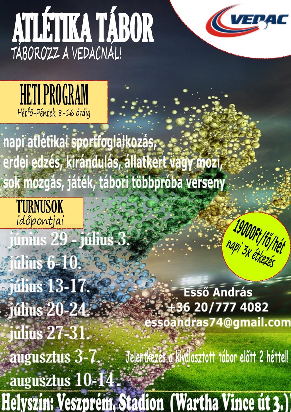 Június végétől augusztus közepéig minden héten várja a táborozni, mozogni vágyó gyerekeket a Veszprémi Egyetemi és Diák Atlétikai Club (VEDAC) a városi stadionban.