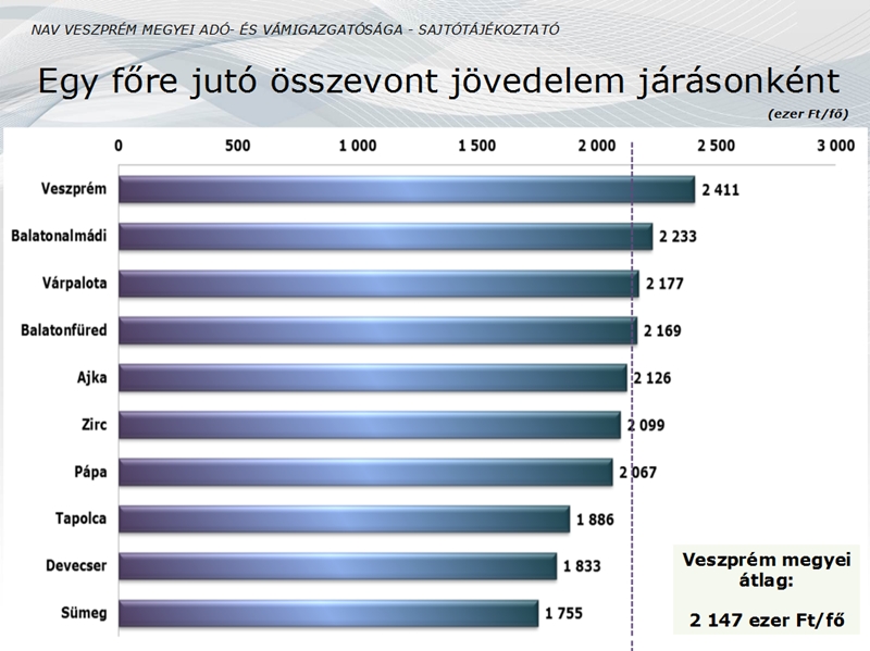 A sajtótájékoztatón szó volt a top jövedelmekről is. A legnagyobb összevont jövedelem - mely egyben bérjövedelem is volt - Veszprém megyében 2015-ben 486 millió forint volt, a második helyezett 325,7 millió forintot ért el, a harmadik helyen szereplő 254,9 millió forintot szerepeltetett a bevallásában. Az első 10 magánszemély 1,7 milliárd forintot vallott be, mely hat százalékos emelkedést tükrözött.