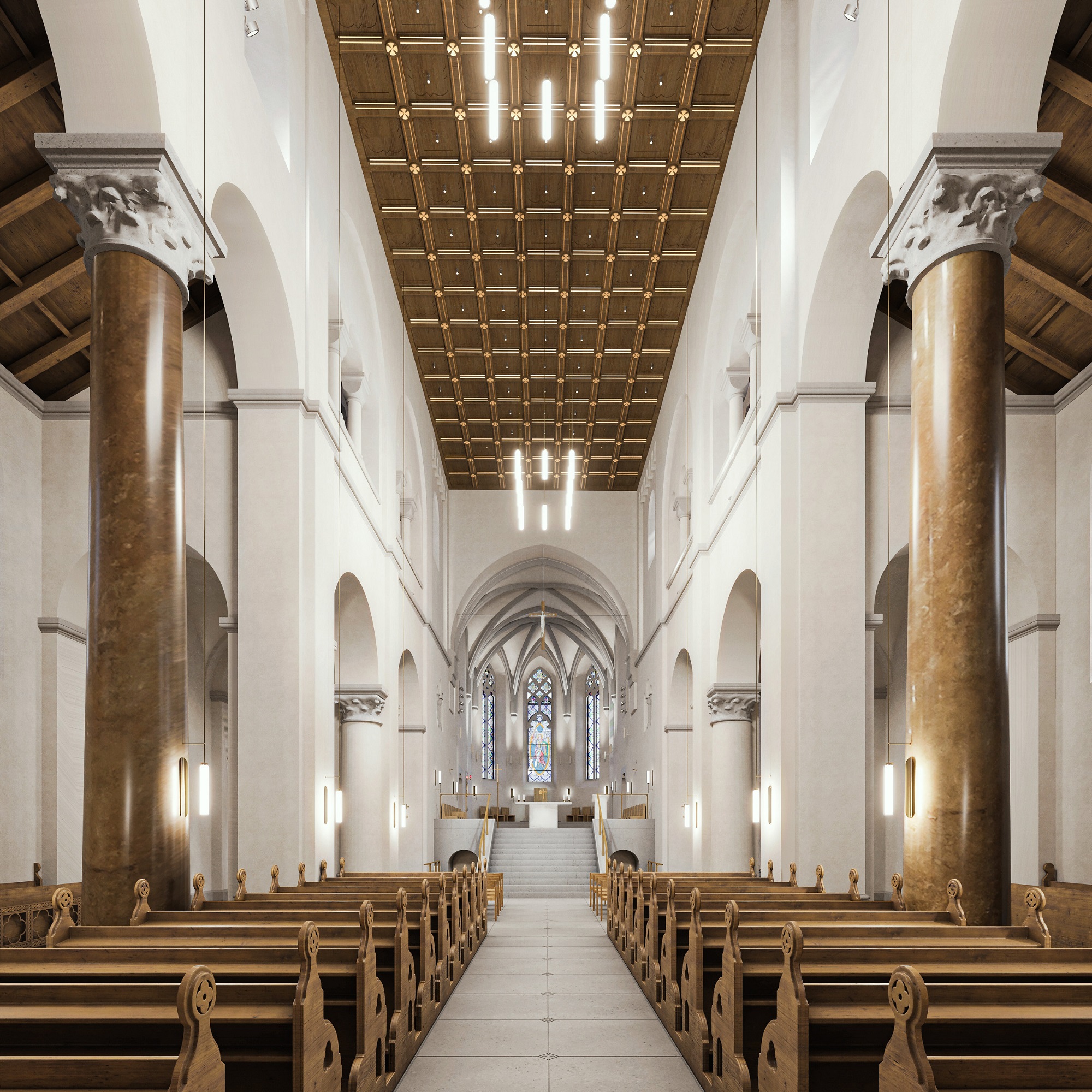 „A Főszékesegyház belső terének egységes stílusú megújításakor a századelős látványt vettük alapul. Ehhez igazodva készültek el a Waltherr Gida által tervezett üvegablakok stílusát visszaidéző új, színes alkotások tervei is, melyek egyike a bazilika védőszentjét, Szent Mihály arkangyalt ábrázolja majd” – emelte ki Vörös Tamás DLA.