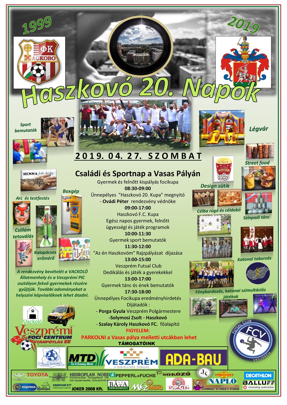 Az eseménysorozat csúcspontja a 12 csapatos Haszkovó 20. Kupa, aminek a Vasas pálya ad otthon április 27-én, szombaton. A rendezvény házigazdája a lakótelep baráti társaságából összeállt, idén két évtizedes kispályás Haszkovó FC. A sporteseményre a bulgáriai Haskovo városából is érkezik egy csapat.