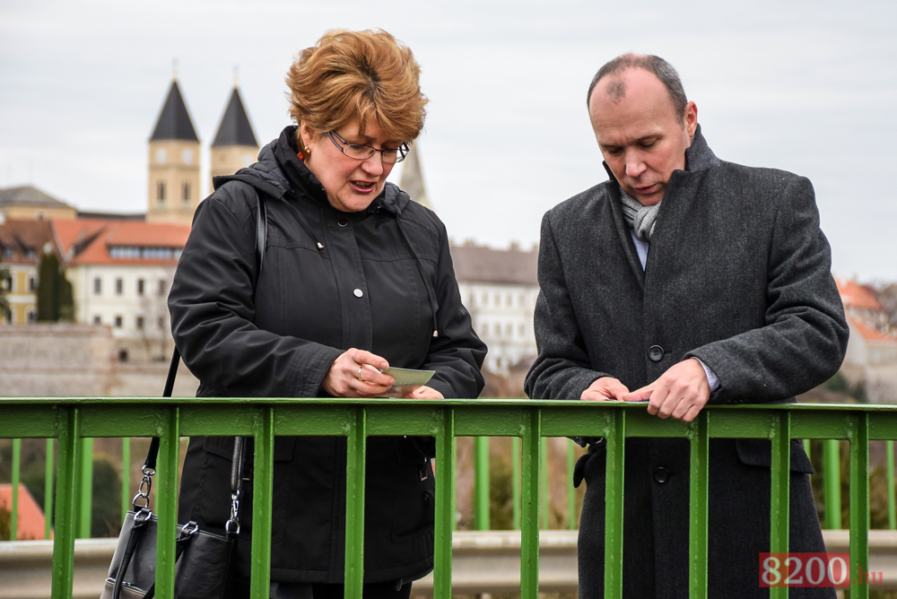 Dr. Payrich Mária és Porga Gyula helyez el matricákat a korláton