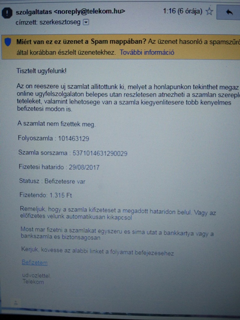 Ön elhinné, hogy ezt a levelet a Magyar Telekom küldte? "Az on reeszere uj szamlat allitottunk ki."